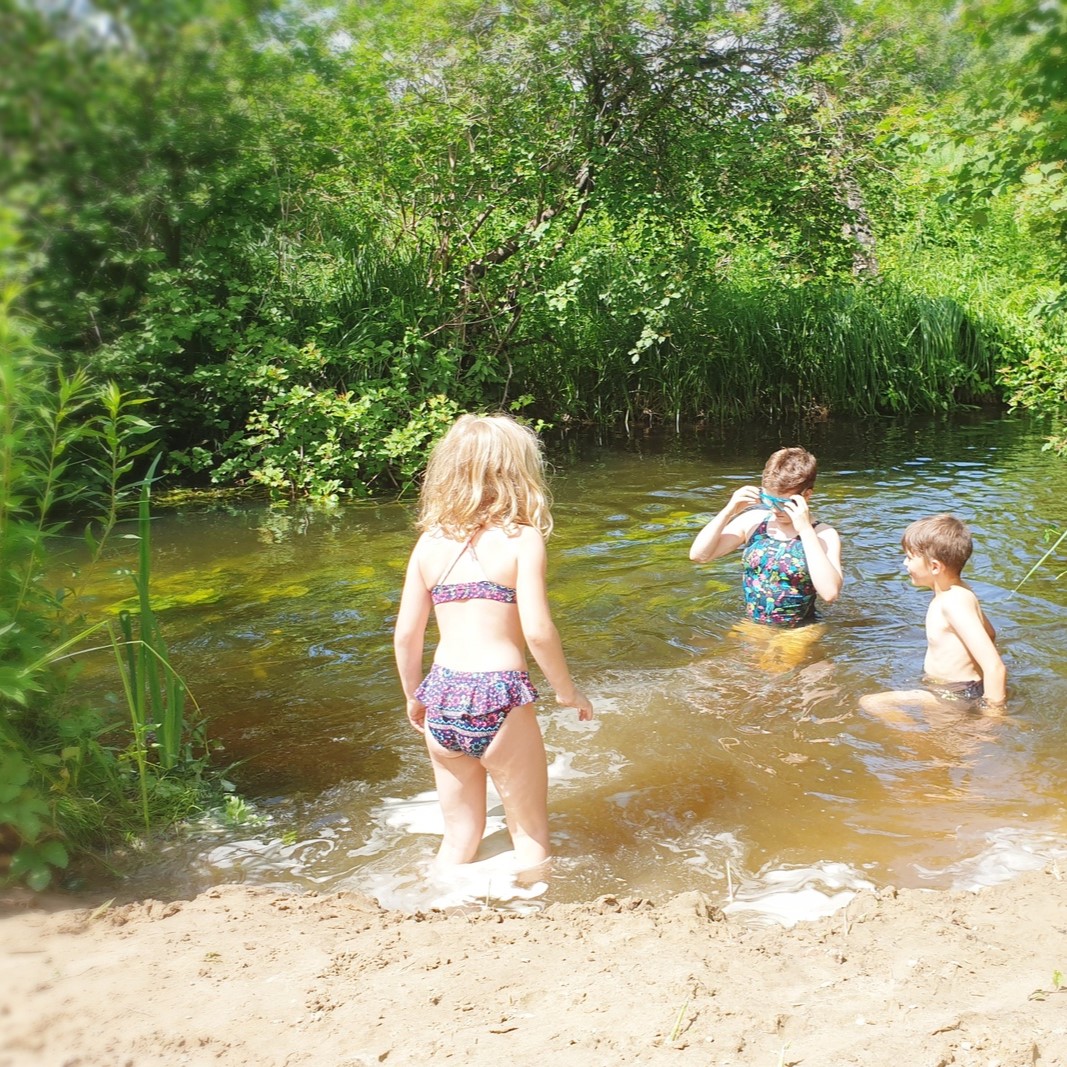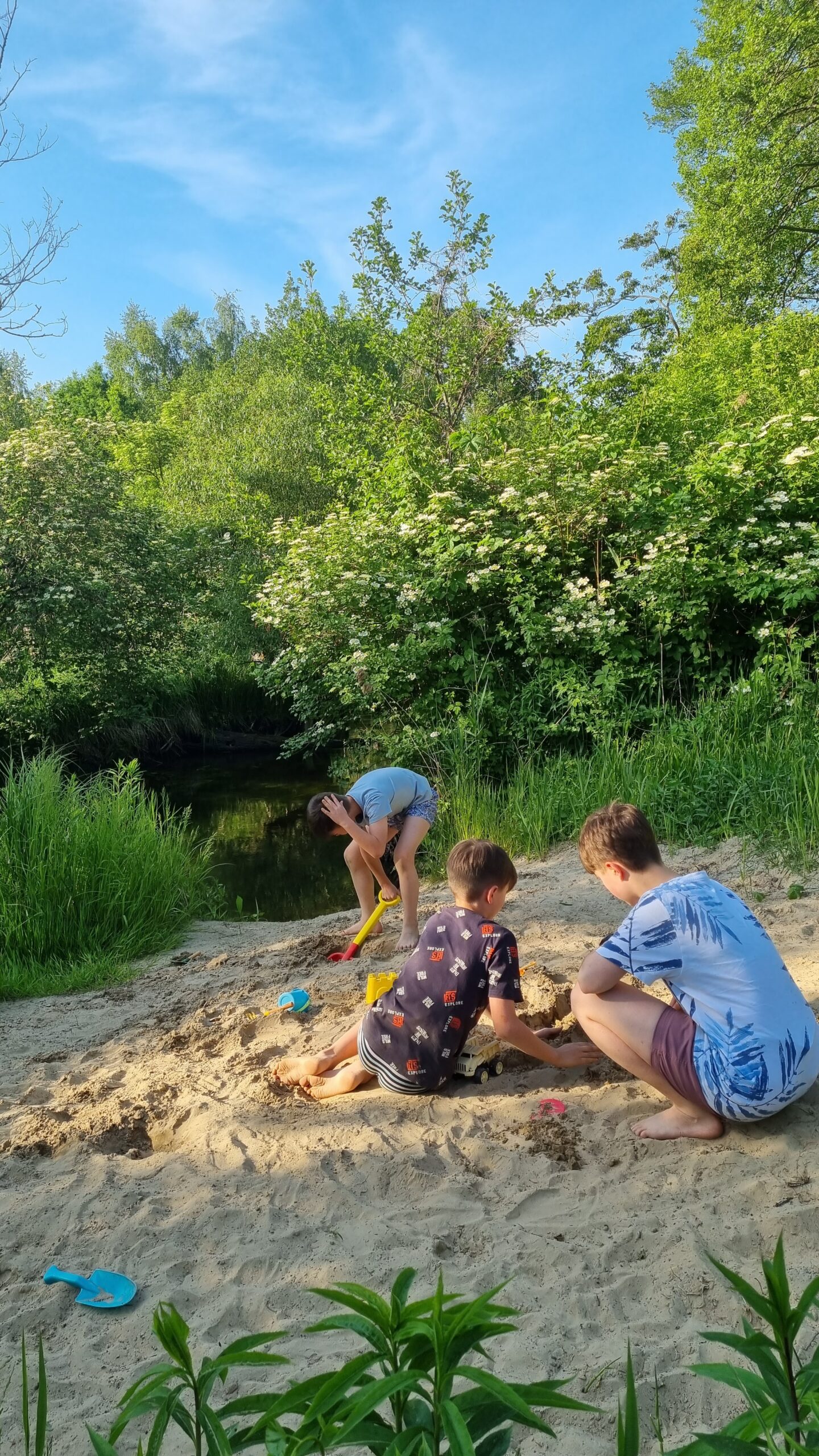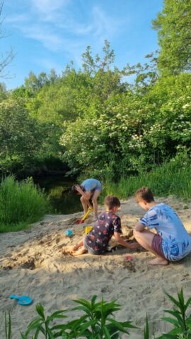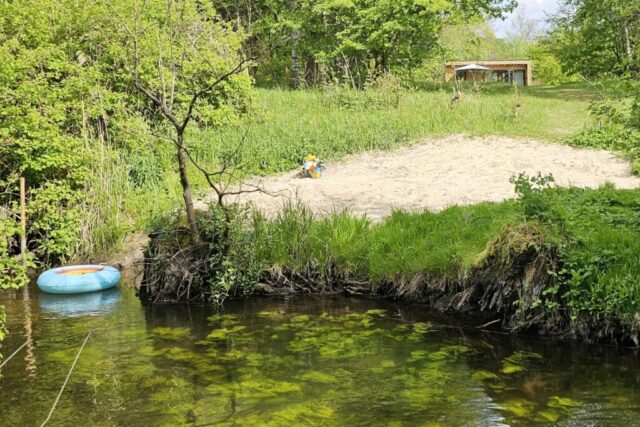 Około 70 m przed domkiem płynie rzeka, nad którą znajduje się mini-plaża wypełniona jasnym piaskiem do zabawy dla dzieci.