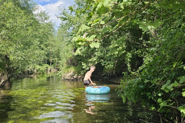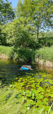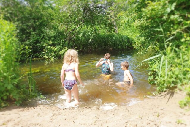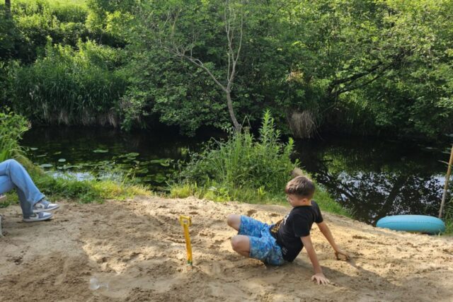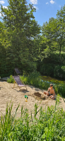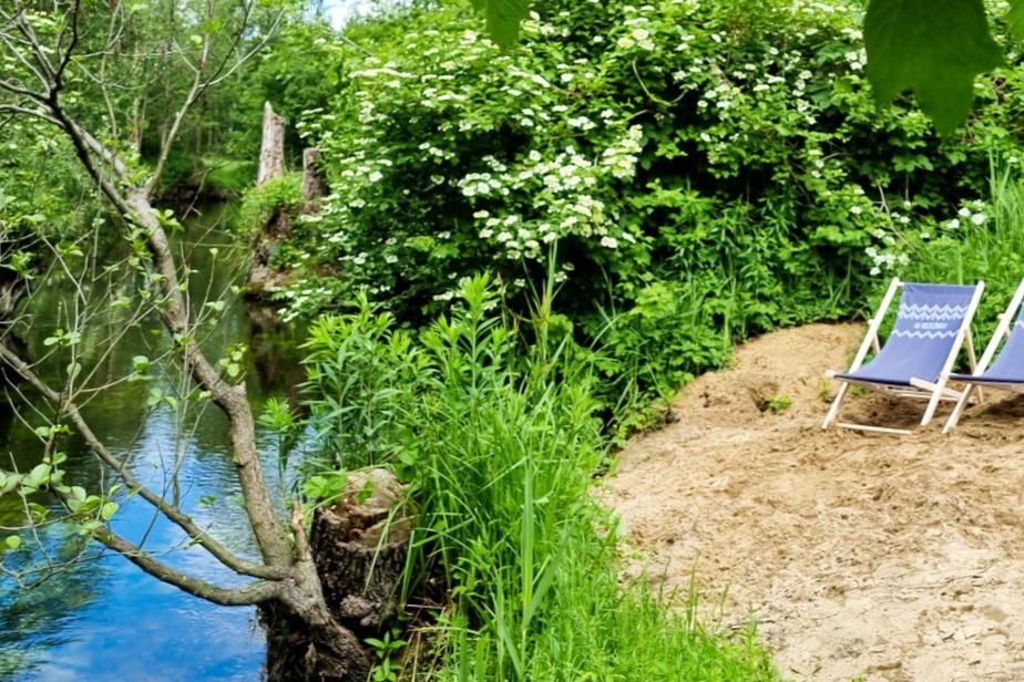 Nad brzegiem rzeki Skrwy stworzyliśmy mini plażę z jasnym piaskiem. Idealne miejsce na poranną kawę, to jeden z dwóch wygodnych foteli ustawionych tutaj na podeście. Dzieci uwielbiają zabawy w piasku i pluskanie się w wodzie. Rzeka jest dzika i miejsca do pływania nie ma dużo, ale i dorośli mogą schłodzić się, wchodząc do wody po pas w upalny dzień lub morsując zimą. Dla chętnych przygotowaliśmy duże dmuchane koło, które zawsze czeka na brzegu — doskonałe do kołysania i relaksu.