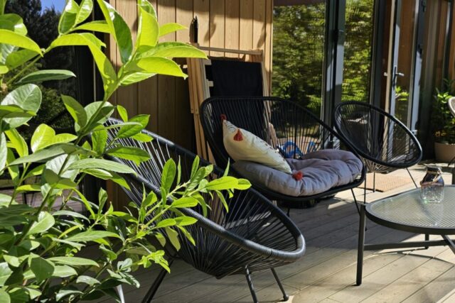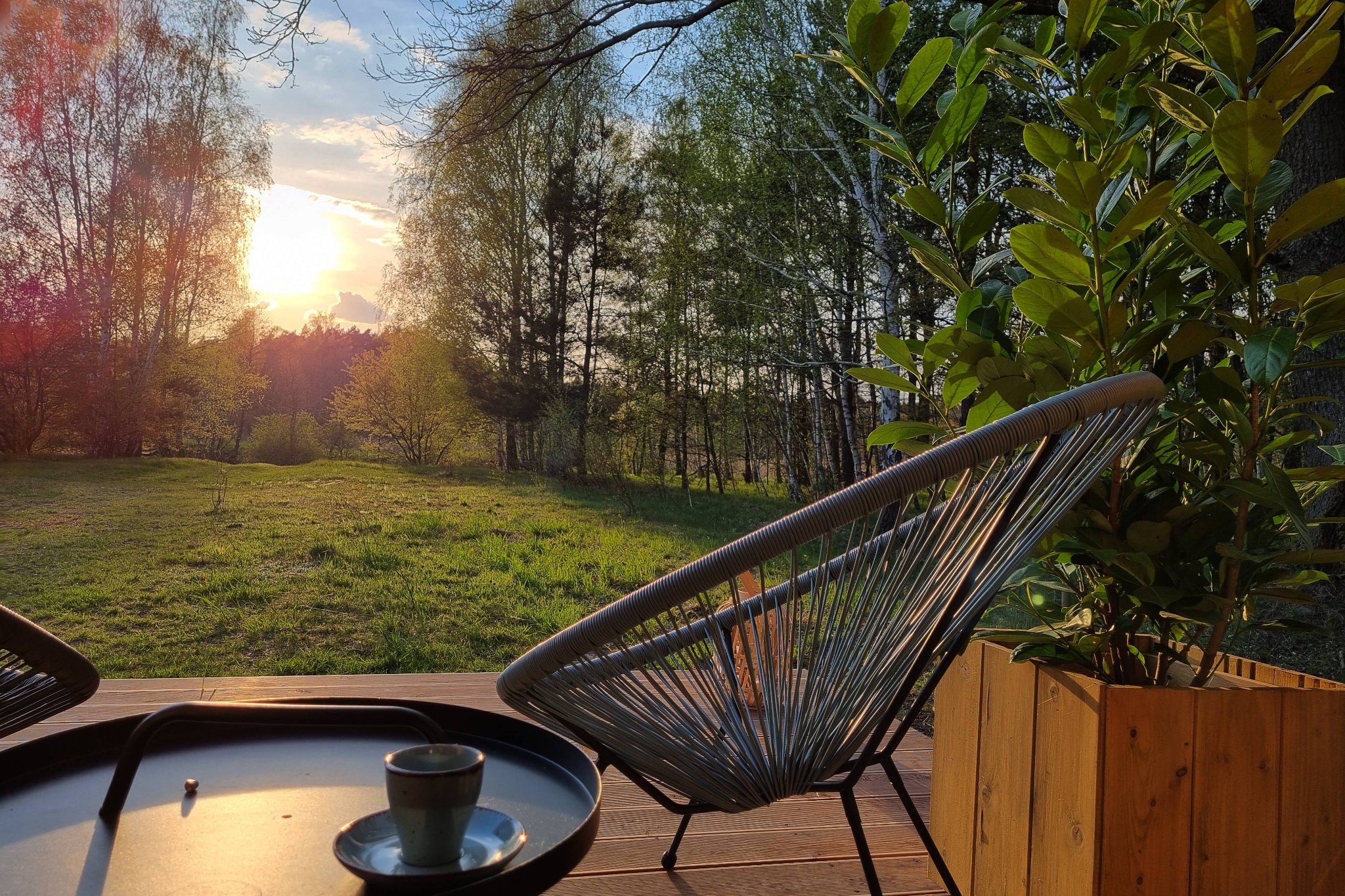 Z sypialni oraz z salonu wychodzi się na duży taras z wygodnymi fotelami i stolikiem, idealny na poranną kawę w otoczeniu zieleni i drzew.